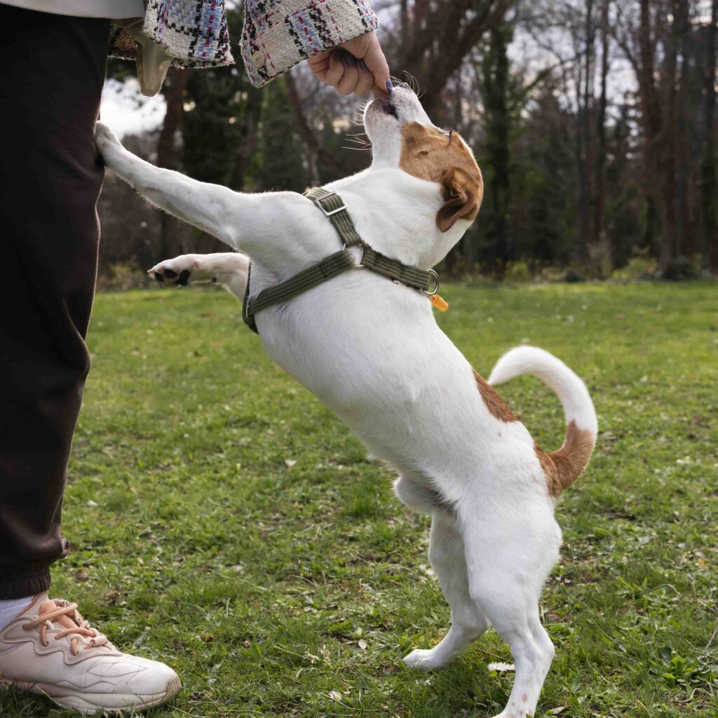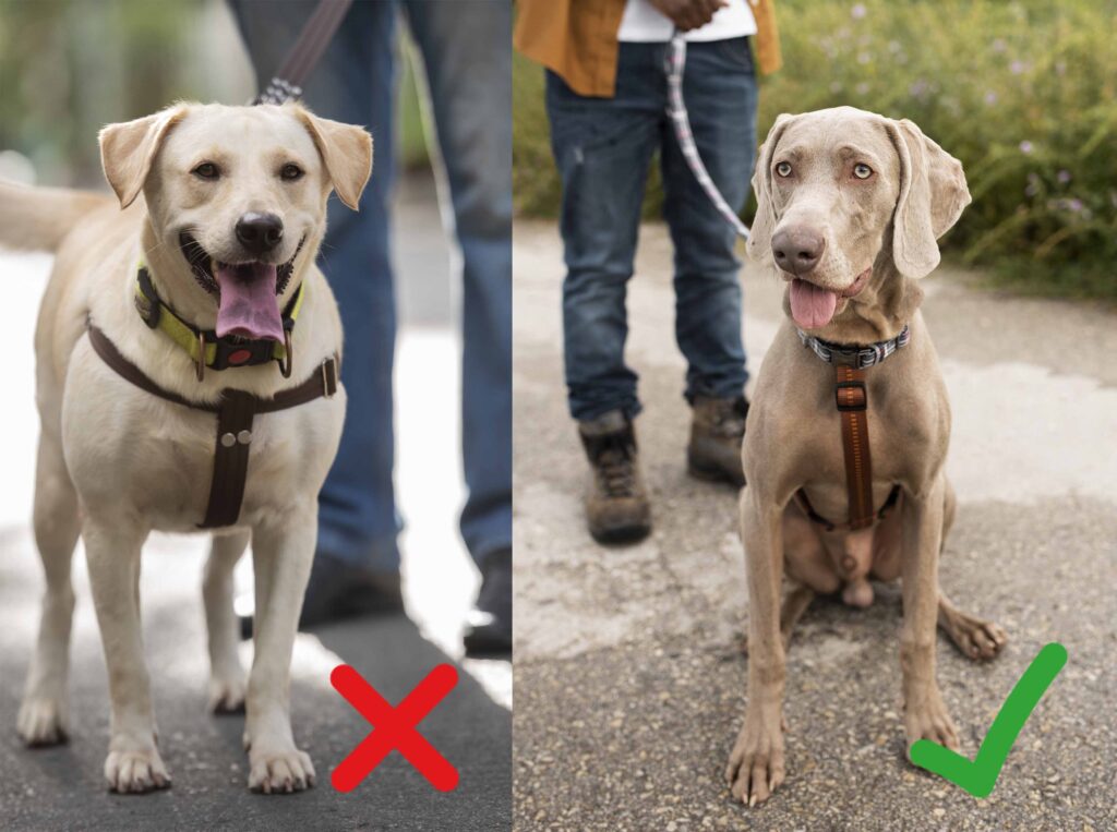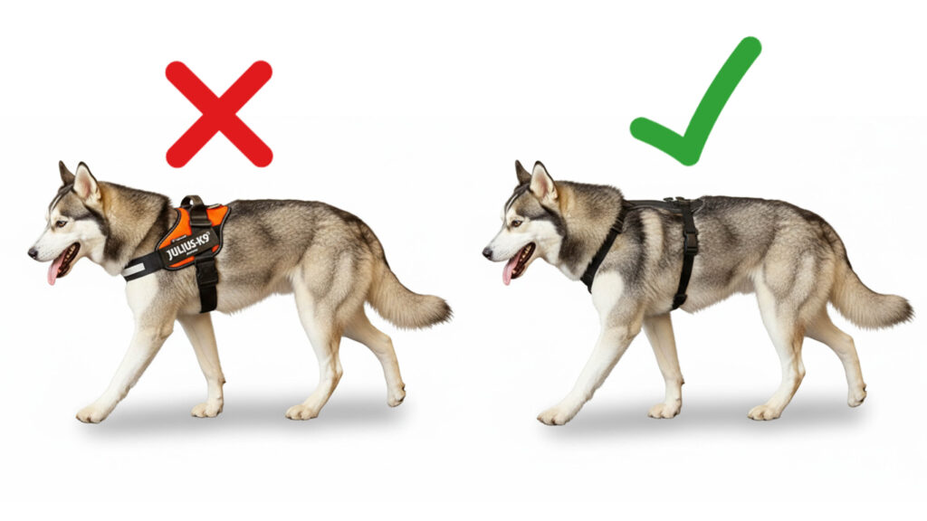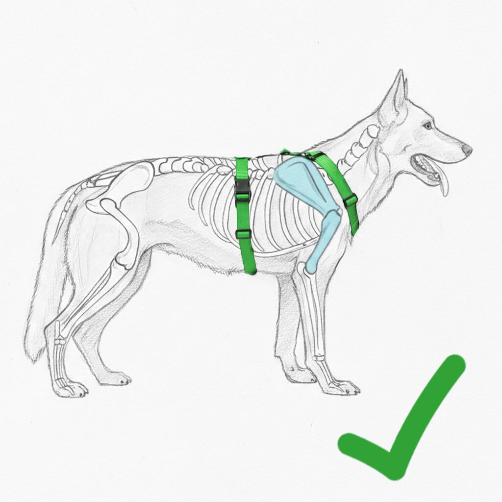 Un arnés adecuado debe permitir que las escápulas (hombros) y los codos se muevan libremente durante cada paso (suelen tener forma de Y o H). Algunos arneses con tiras cruzadas o muy bajas sobre el pecho pueden impedir el rango completo de movimiento de las patas delanteras, lo que obliga al perro a caminar “encogido” o más rígido.