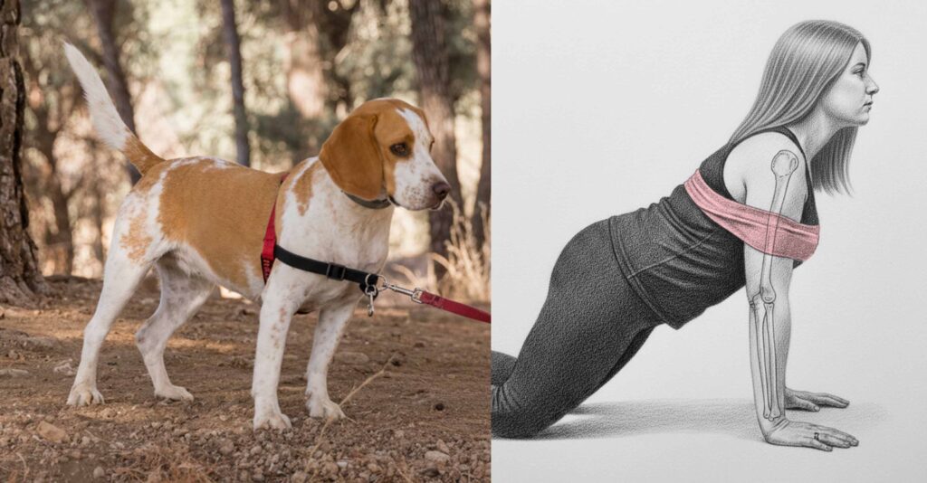 Cuando un perro no puede mover sus hombros o codos de forma natural debido a un arnés mal diseñado o mal ajustado, cambia la manera en que distribuye el peso de su cuerpo. Este cambio obliga al perro a realizar compensaciones constantes durante el movimiento, generando tensión crónica en la musculatura, sobrecarga en otras articulaciones y una postura menos equilibrada.