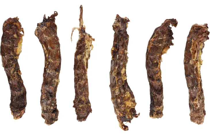 - Tráqueas deshidratadas: De textura blanda a media. Contienen colágeno y glucosamina, lo que puede ser interesante en perros jóvenes en crecimiento, o perros con problemas de artrosis, cojeras… En general, son buenas para perros con problemas de huesos.
